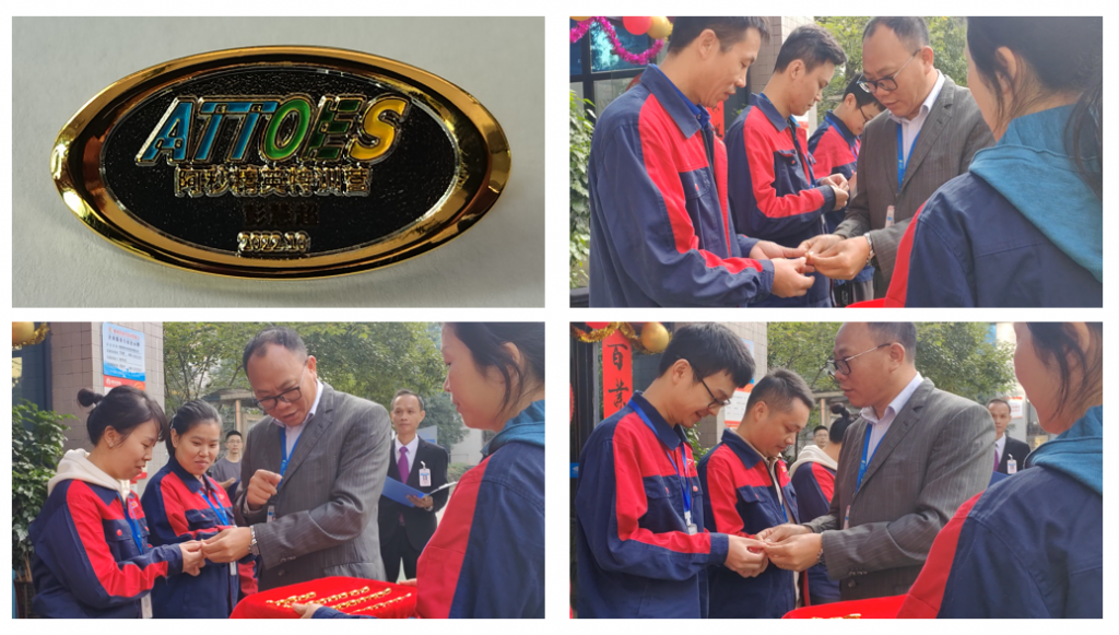 紧接着进入了仪式的第二项议程——“授勋仪式”。阿秒光学董事长、总经理、精训营总顾问黄柏良上台为34名精训营成员颁发了象征“精训营”光荣身份的“阿秒精训营团队徽章”。阿秒精训营徽章由合金材质制成,呈椭圆状,长35毫米,高18毫米,采用镀金、磨砂和镭射扫码工艺制成,正上方镌刻着“ATTOES”彩色LOGO,下方对应着“阿秒精英训练营”以及队员姓名和“2023.10”字样,徽章整体设计小巧精致,简洁时尚,识别性强,全体队员均认真佩戴好,倍感荣幸和荣耀!之后,黄柏良董事长与小组成员逐一合影留念,记录下这难忘的喜庆时光。