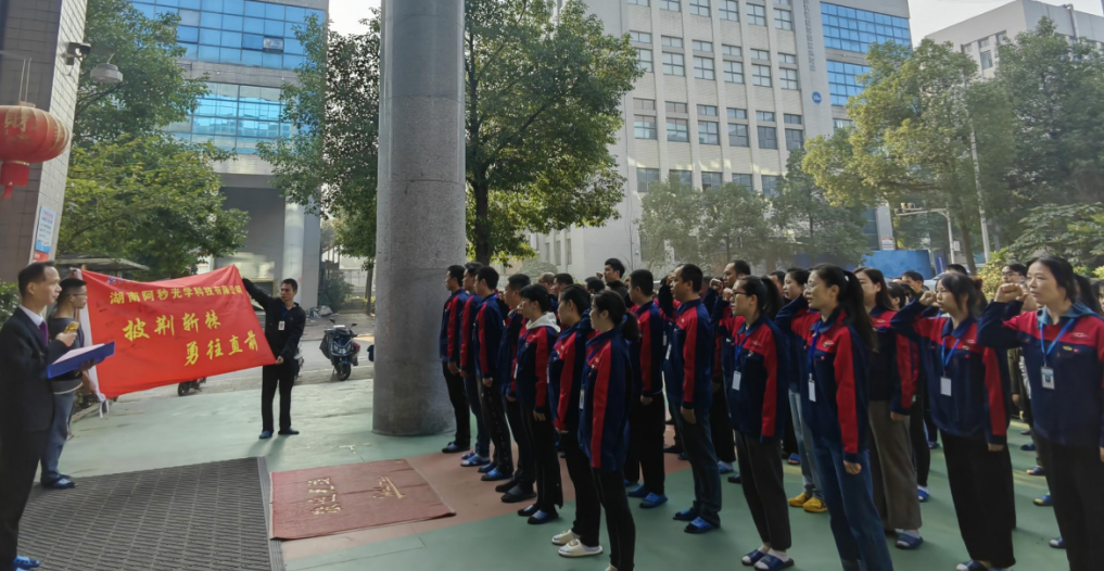接着,是仪式的第三项——“宣誓环节”。只见30余名队员整齐列队,在主持人的带领下,面向队旗高举右手集体宣誓“爱国爱党,对公司和营队忠诚,拥护营队纲领…积极工作,努力学习,勤奋锻炼,不断提升,为实现阿秒光学的宏伟目标而努力奋斗”!整齐响亮的铮铮誓言响彻在园区上空,彰显出阿秒精英团队团结刚毅、勇往直前、斗志昂扬的精神风貌……