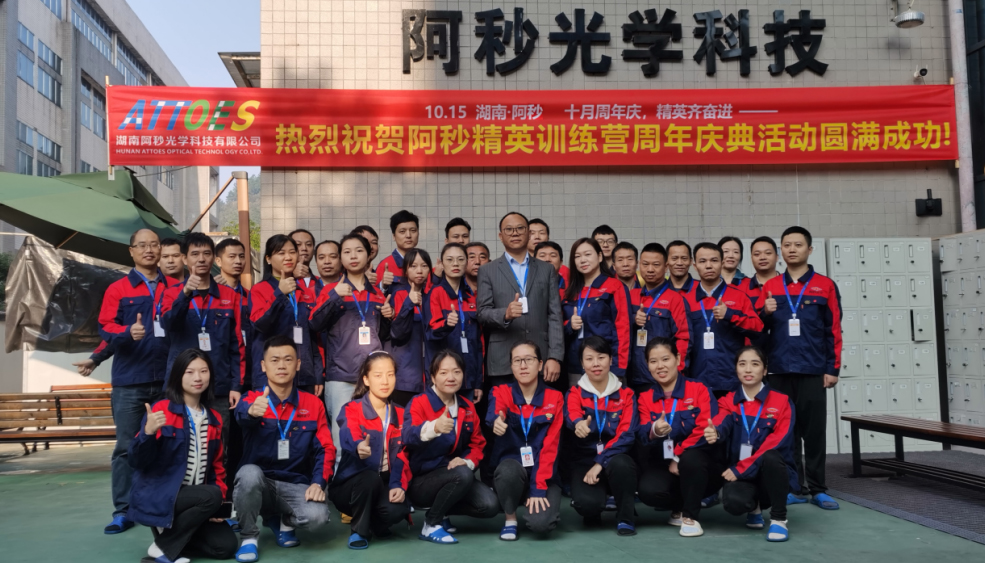 10月15日清晨,经开区园区12栋、湖南阿秒光学科技有限公司大门前被装饰一新,只见公司前坪干净整洁,一条主题鲜明的红色庆典横幅迎风招展,大门两侧的金色彩带和气球在秋日晨光照耀下显得格外耀眼和喜庆!阿秒全体员工整齐列队,一场主题为“十月周年庆,精英齐奋进——阿秒精训营成立一周年”的庆典活动将在此隆重开展。